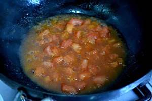 烧热后倒入适量油,放入切好的番茄,中火不断翻炒。番茄炒出汁以后加入两勺番茄酱继续翻炒加入小半碗水