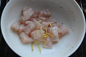龙利鱼解冻后用厨房纸擦干水分,切成1.5厘米见方的块,加入适量橄榄油、少量黑胡椒、姜丝腌制15分钟。