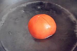 番茄顶上用刀划十字,放在滚水中烫一下,这样很容易去皮哦!去皮的番茄切成小块备用