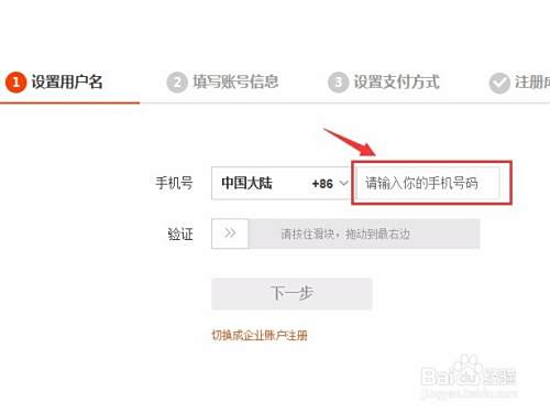 第二步:新用户注册,个人用户可以使用手机号进行注册,企业用户需要通过邮箱才能注册,今天讲解个人用户怎么注册淘宝账号,正确地填写个人的手机号码,输入手机号码之后,从左往右滑动验证条,然后点击下一步。