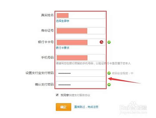 第五步:填写“真实姓名”,“身份证号”,“银行卡号”,“手机号码”和“支付宝支付密码”。身份证号要跟银行卡号统一,不能使用他人的银行卡号。支付宝支付密码不是登录密码,是在支付的时候使用的密码,要跟登录密码进行区别不一样。