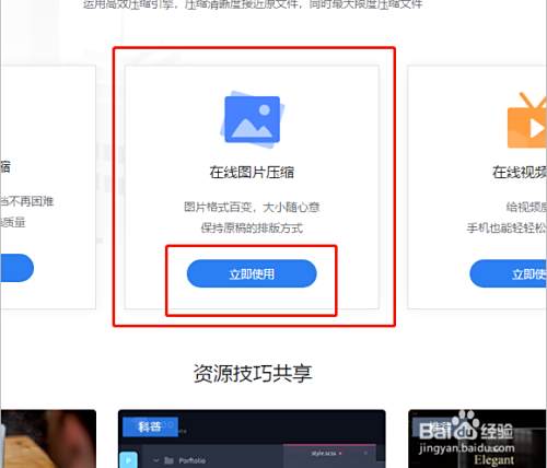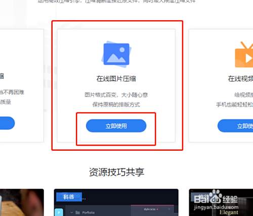 搜索在线图片压缩,找到在线图片压缩的网站后并打开,点击在线图片压缩下面的立即使用按钮。