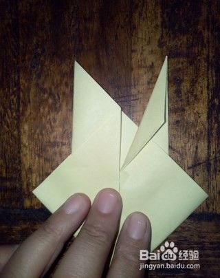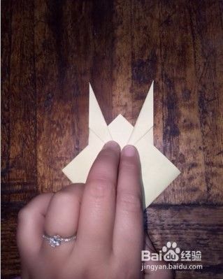 如图,把上端耳朵的中间部分,向外折,使之更细一些。同理完成左侧的折叠。
