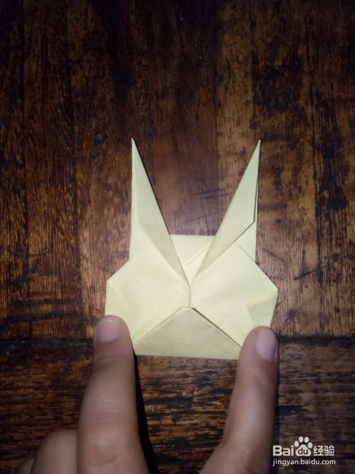 如图,左后在我们折叠好的图形上,画出比卡丘的形象。小眼睛和红色腮红。折纸完成。