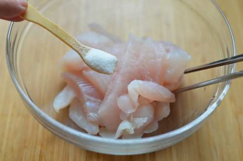 4加入料酒,黑胡椒粉搅拌均匀,腌制1个小时让鱼片入味。