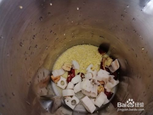 把小米和红枣还有莲藕丁放进豆浆机里,加入适量的清水,然后打成米糊