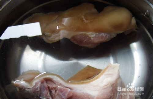 把猪蹄膀分成两部分,把当中带骨的肉分离出来,去毛刮洗干净。