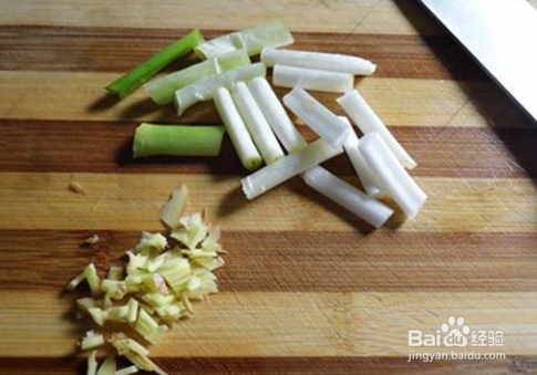 将姜剁成姜末,葱切成段,蒜捣烂。