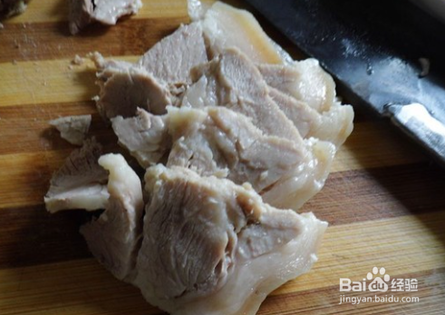 将之前煮好,浸泡的肉捞出,切成一片一片的。