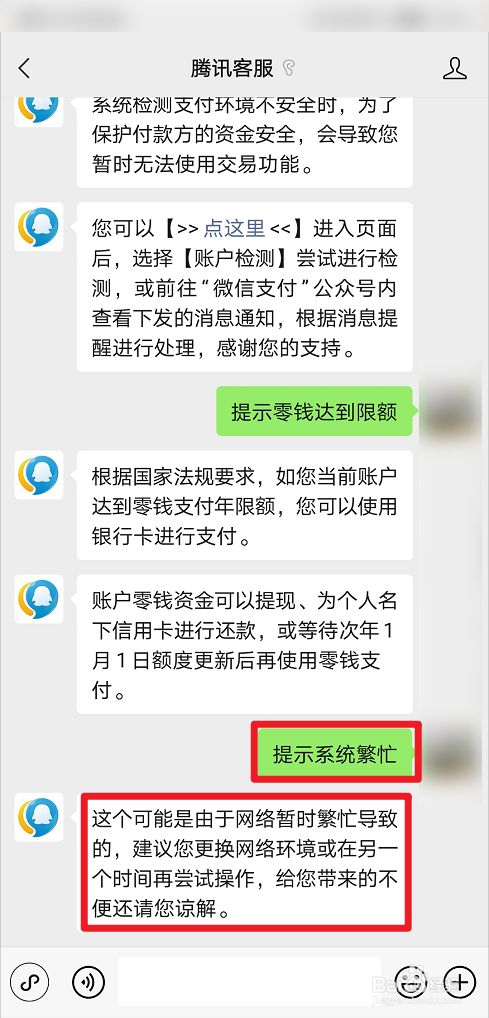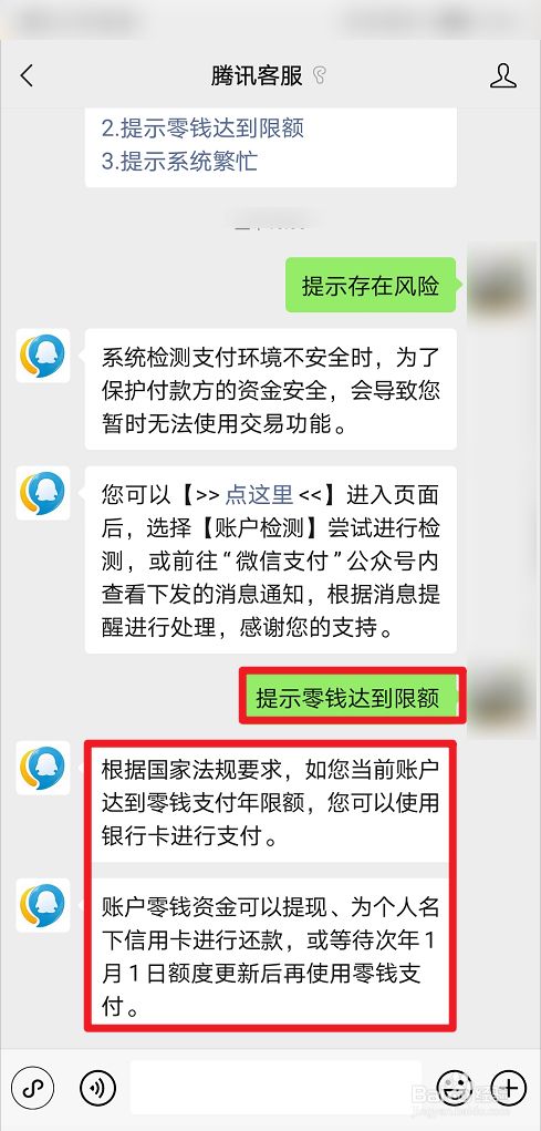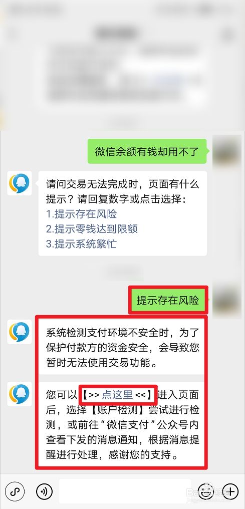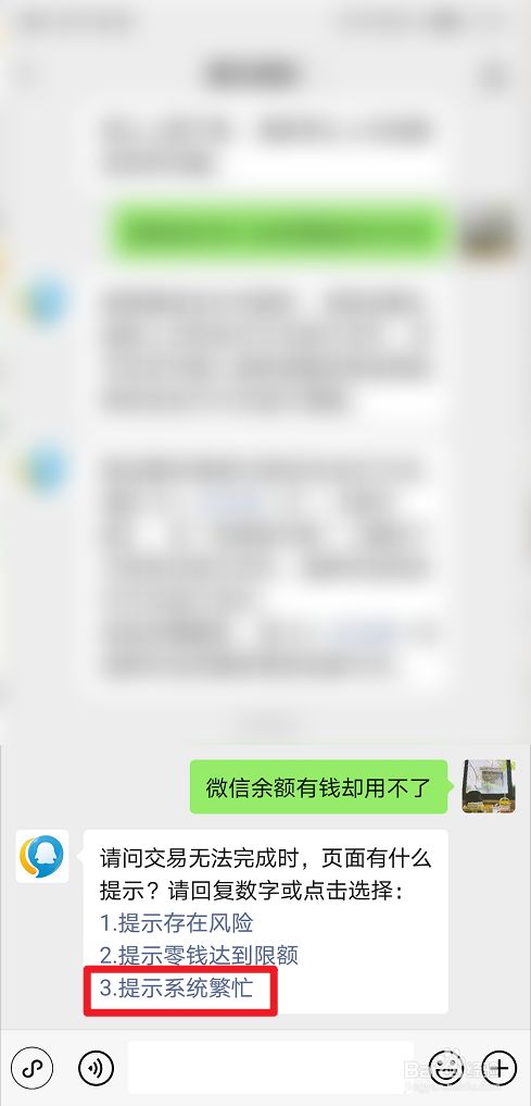在对话框中输入“微信余额有钱却用不了”,根据实际情况选择,例如选择“1.提示存在风险”。