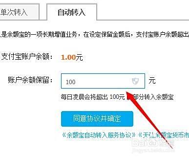点击“开通”之后,在自动转入设置账户余额保留的金额,这个可以根据自己的具体需要来进行选择。