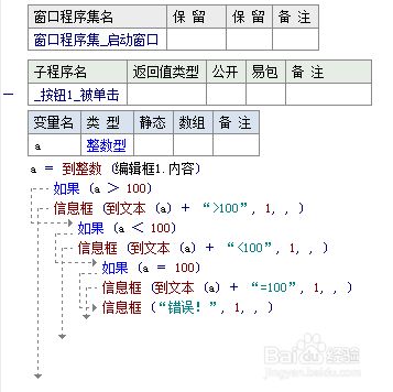 a = 到整数 (编辑框1.内容).如果 (a > 100) 信息框 (到文本 (a) + “>100”, 1, , ).否则 .如果 (a < 100) 信息框 (到文本 (a) + “<100”, 1, , ) .否则 .如果 (a = 100) 信息框 (到文本 (a) + “=100”, 1, , ) .否则 信息框 (“错误!”, 1, , ) .如果结束