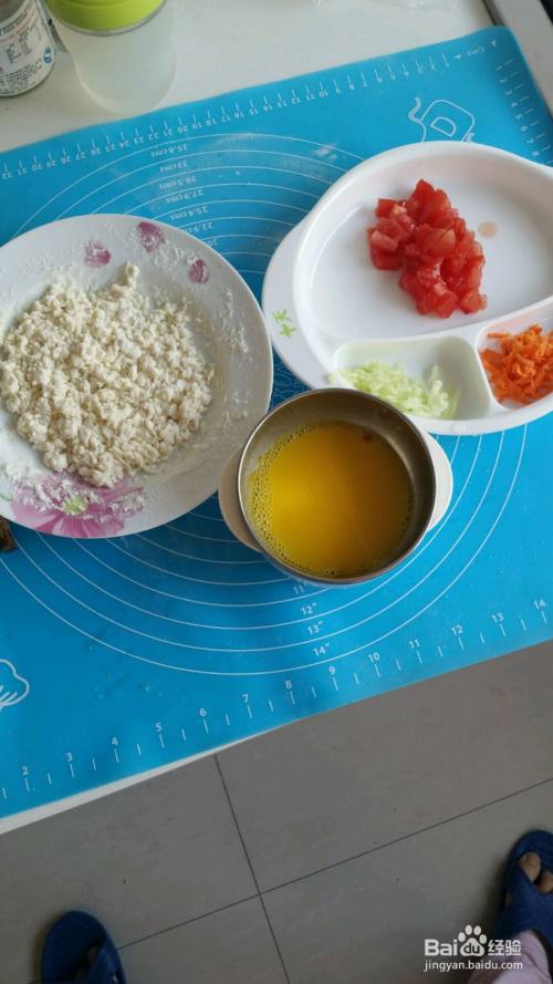 一个笨鸡蛋打散,切西红柿丁,黄瓜胡萝卜擦丝,切点葱花,二分之一量杯的面粉倒入平盘中,我用的是电饭煲赠送那么大的量杯,用可么多么的奶瓶往面里喷水,或者用小喷壶,边喷边搅拌,这样扮出来的面疙瘩比较细腻均匀
