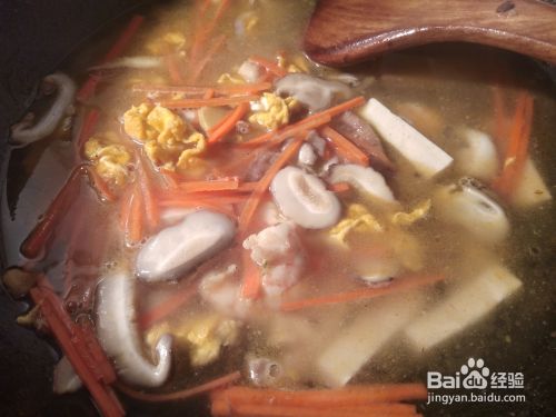 把炒鸡蛋、胡萝卜丝和豆腐放进锅里。少加盐和一勺蚝油。用大火煮5分钟