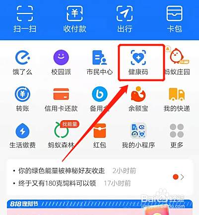在支付宝的首页点击健康码。