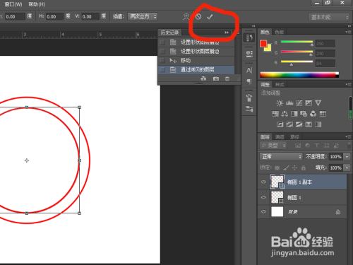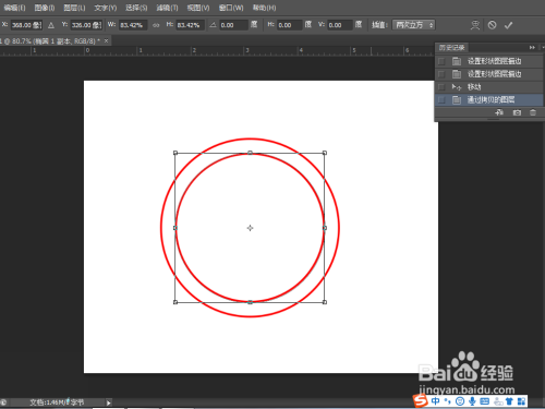 在新复制的图层上,同时按住shift+Alt键,拉动圆形,即可使圆形图案朝圆心等比缩小;