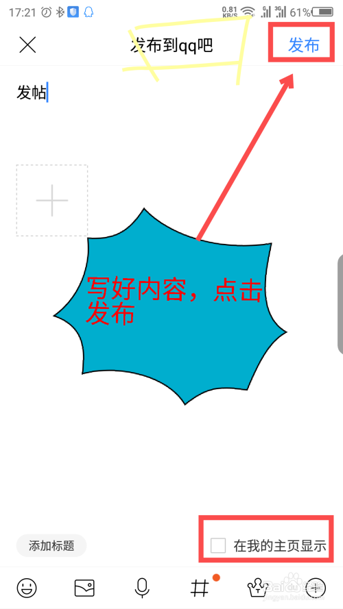 在编写界面,能看到文字说明发布到某个贴吧,也可以勾选在我的主页显示。编写完内容,就可以点击发布了。
