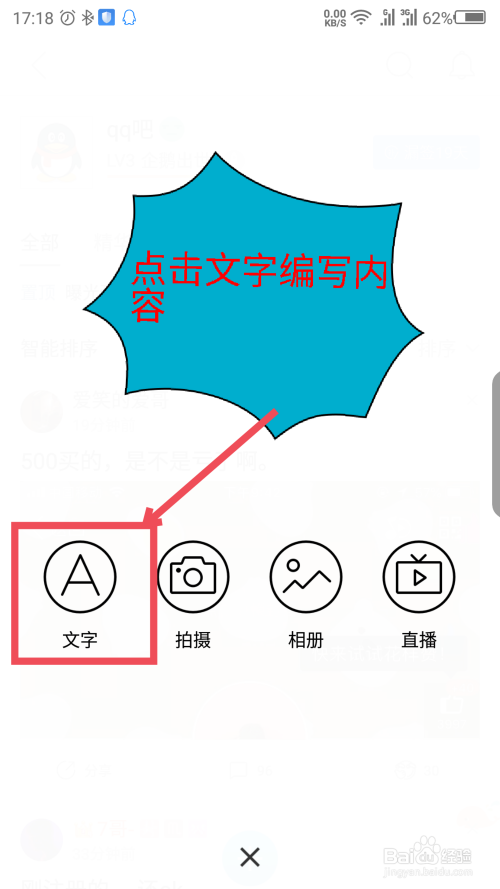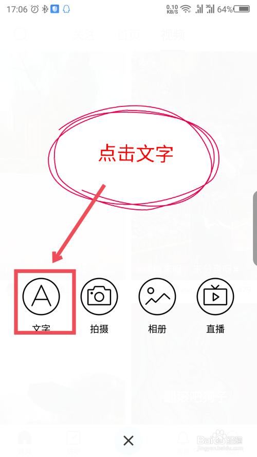 点击后,可以选择文字拍摄和相册,也可以直播。不过发帖,点击第一个文字就可以了。