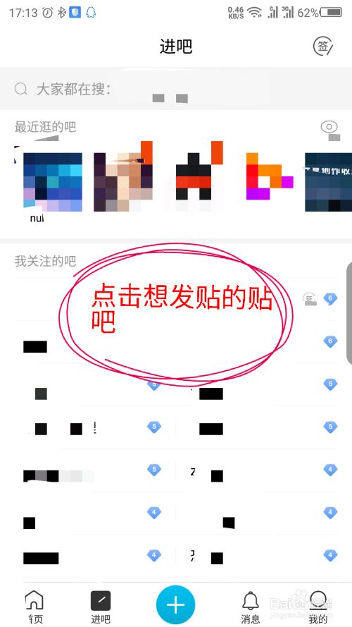 在进吧界面中,点击想发帖的贴吧,或者搜索想发帖的贴吧关注。
