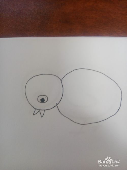 然后需要在小脑袋上眼睛下方,绘制一个小嘴巴,这个小鸡的嘴巴在下方?没错,因为他正在低头啄米。