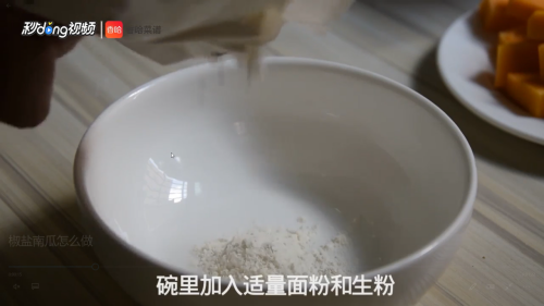 南瓜洗净,切条,碗里加入面粉和生粉。