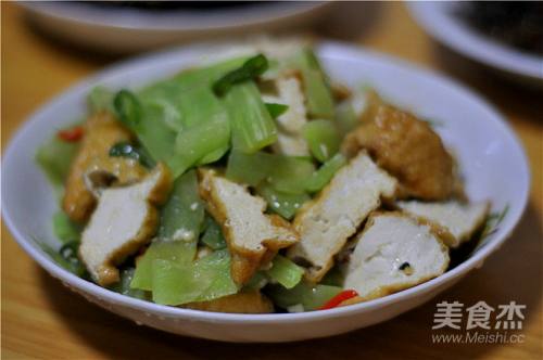 3将油豆腐片倒进去,翻炒几下,莴笋片和辣椒也倒进去