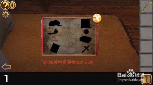 进入房间后,首先我们会看到房间的地毯上有香烟和扳手,我们捡起这两个道具。同时点击游戏画面右下角方框的“0”,这时会弹出一个画面,画面显示的道具就是我们需要在6关游戏中需要收集的道具,香烟就是其中之一。