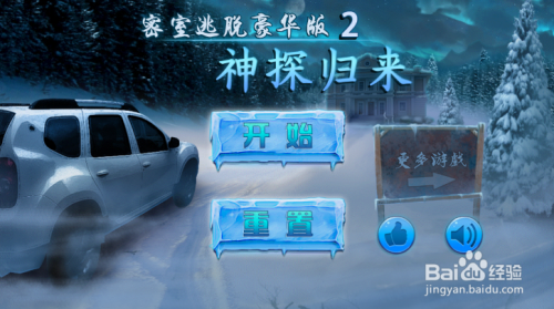 首先我们打开密室逃脱豪华版2游戏,然后在游戏进入界面我们点击“开始”按键,这时会弹出第一关的窗口,我们点击该窗口从而顺利来到第一关的房间中。