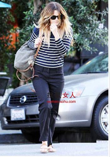2蓝白色的条纹套头毛衣,条纹是永不过时的单品。搭配一条蓝色掐腰九分休闲裤简单随意,干练有型的出街装扮。