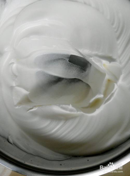 现在要开始打发蛋白液。蛋白加糖60克,糖要分三次加进去。先用打蛋器打发蛋液,出粗泡泡后加1/3的糖;再打发蛋液,出细沫沫后加1/3的糖;继续打发蛋液,出现纹理后加入剩下的1/3的糖,继续打发,直至提起打蛋器出现小尖角就算打发好了。