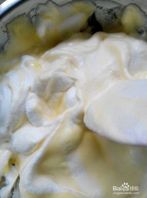取1/3的蛋白液放到蛋黄液里上下搅拌均匀,一定不能打圏。