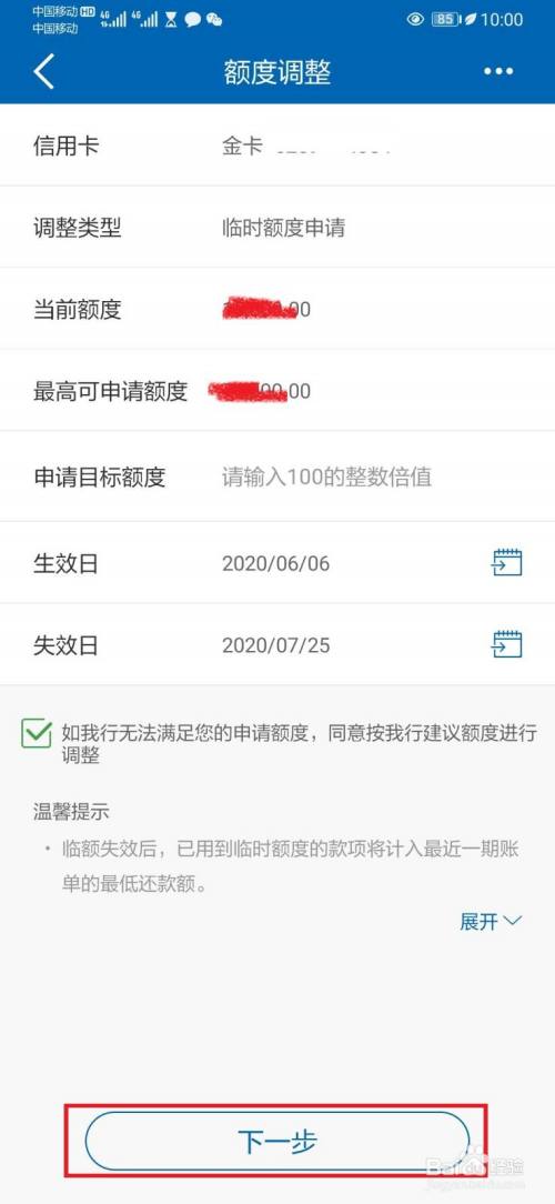 进入临时额度调整设置页面,根据页面提示进行相应信息输入后,点击【下一步】,完成手机短信验证,即可。如下图所示。