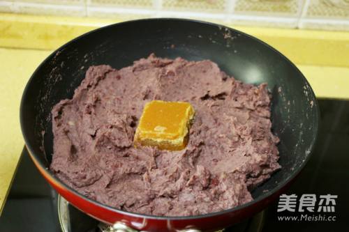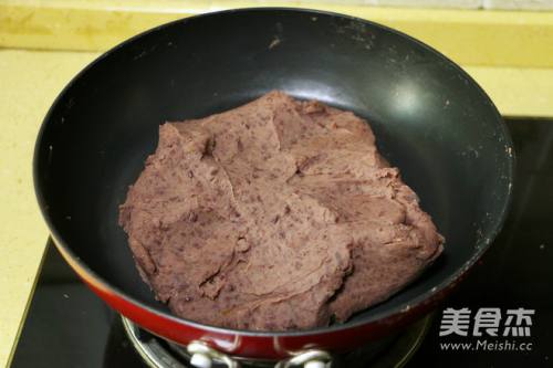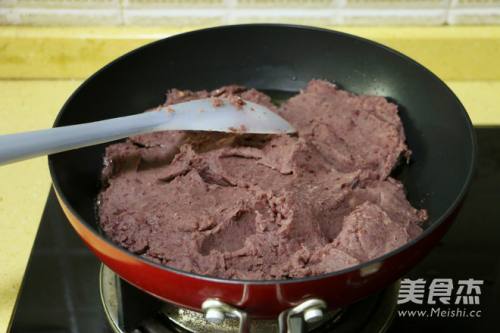 11全程小火,将红豆泥倒入锅中,不断翻炒片刻