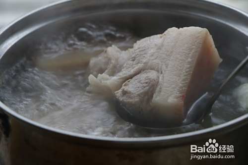 2、五花肉冷水下锅,放入葱、姜、料酒焯水2-3分钟,捞出沥干水分;
