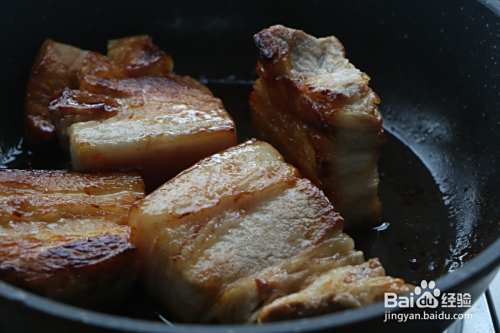 3、锅中加入稍微多一点的植物油,放入20克冰糖炒出糖色,然后把五花肉放进去煎至两面金黄色,把肉皮也朝下煎至金黄色;