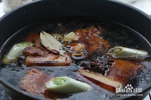 4、然后加入可以没过五花肉的清水,加入葱、姜、花椒、八角、桂皮、香叶、生抽、老抽、盐;
