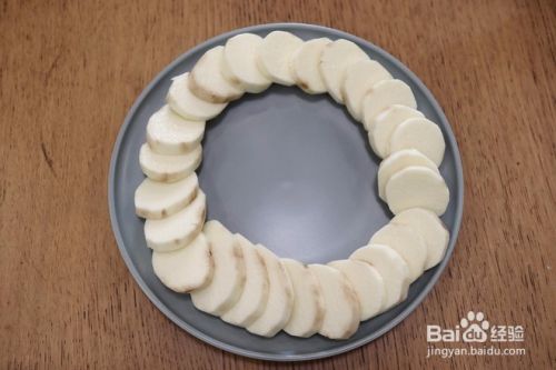 取一个大平盘,用筷子夹着山药片或者手指尖捏着山药片沿着盘子摆放一圈,山药片不是全部都是圆的,所以尽可能让圆头都露出外面,看着漂亮;山药片上有黏液,用筷子夹着摆盘有难度,可以用手指来辅助;