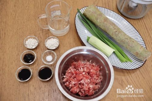 全部材料准备好,从右向左分别是主料、调料、芡汁用料;青蒜叶可换成香葱,淀粉用红薯淀粉、玉米淀粉均可;肉馅宜用瘦肉;