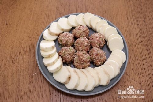将肉丸码放在山药摆成的圆圈内,肉丸的大小随自己的喜欢及肉量的多少来调整;