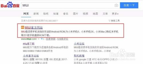 使用百度系统搜索“MIUI”关键字,在搜索结果页面中,点击进入MIUI系统下载页面,在小米MIUI论坛官网下载好对应手机型号的系统版本。