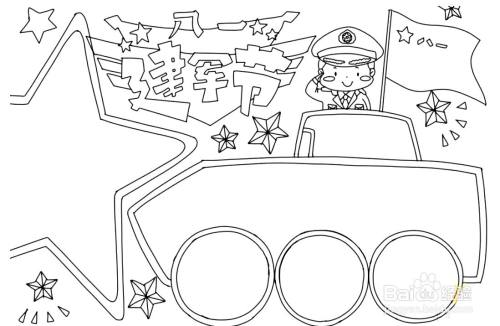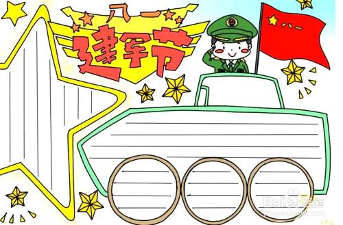 左侧用五角星作为边框,可以写上文字,右侧可以画出坦克的外形。