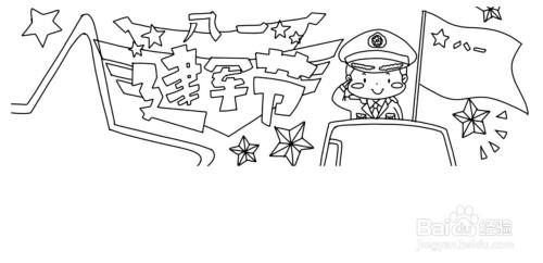 在周围,画上一个敬礼的军人卡通画,画出五星红旗。