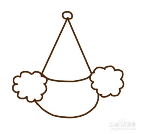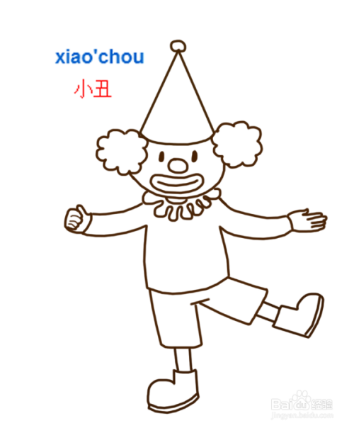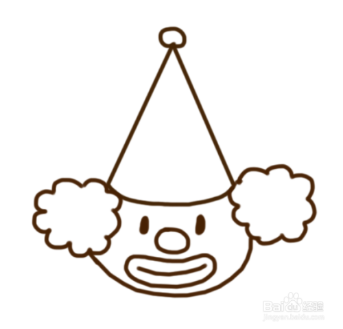 接着画上小丑小小的眼睛,圆圆的鼻子和香肠一样的嘴巴。