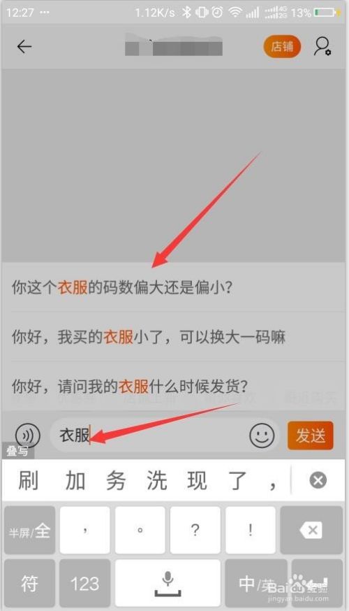 回到聊天界面,在文本框处输入文字,比如衣服,上方即联想出了三个问题,可以看看是否是自己刚好想要输入的,点击即可。