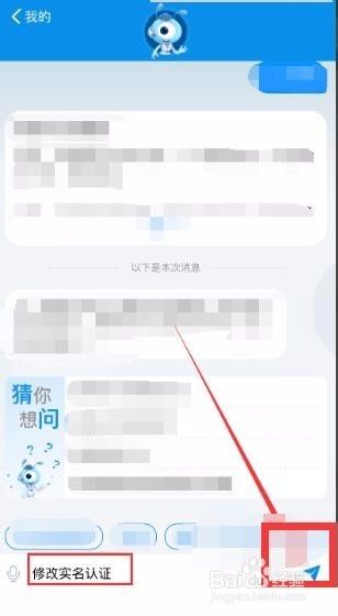 在出现的界面中,输入“修改实名认证”,点击“发送”按钮