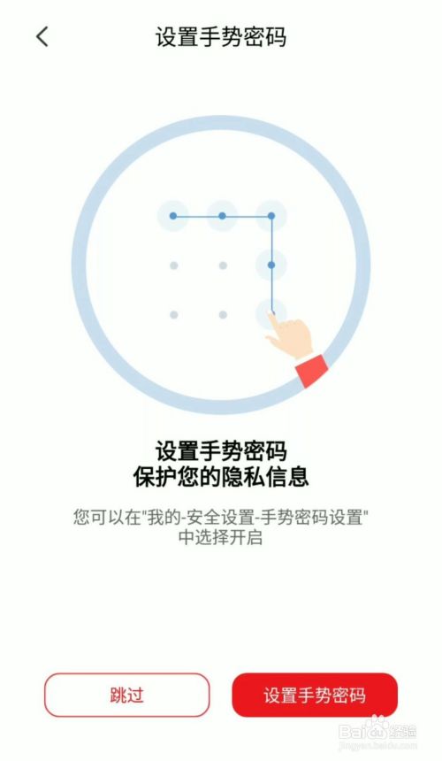 登录密码设置完成后,进入设置手势密码页面,这里根据自己的需要,可以设置也可以不设置,不设置点击“跳过”即可。