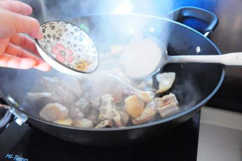 接着,放入腊鸭,翻拌均匀