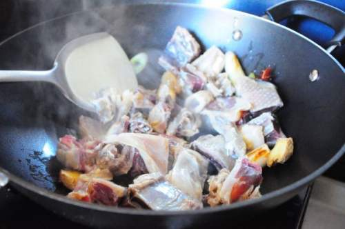 7接着,放入腊鸭,翻拌均匀