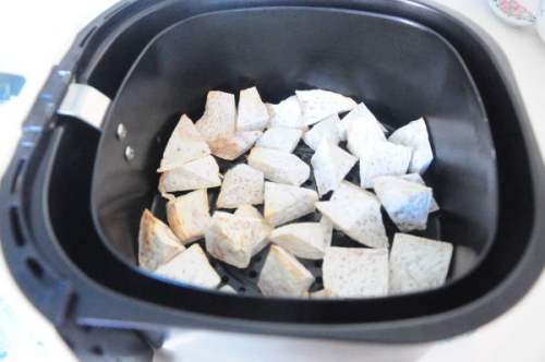 烧腊鸭时,准备荔浦芋头,芋头去皮,洗净,切成滚刀块后,放入空气炸锅,160度,15分钟