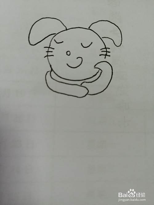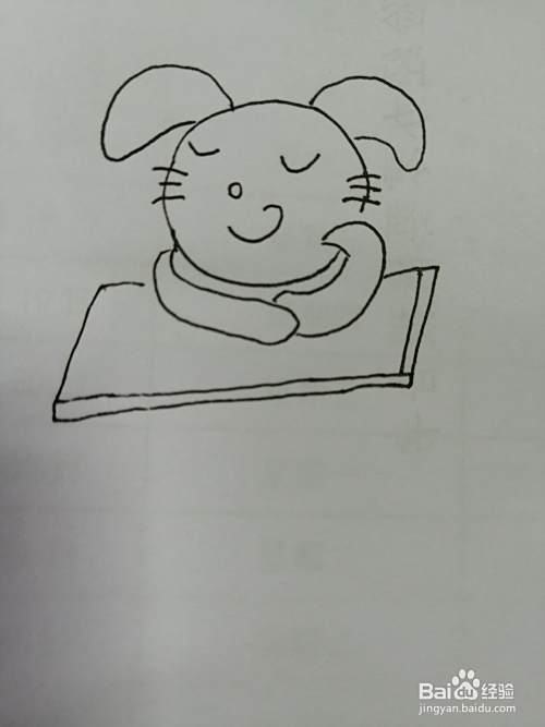 第四步,在睡着的可爱的小兔子的头部下面画出两只小手,一只手托着脸。